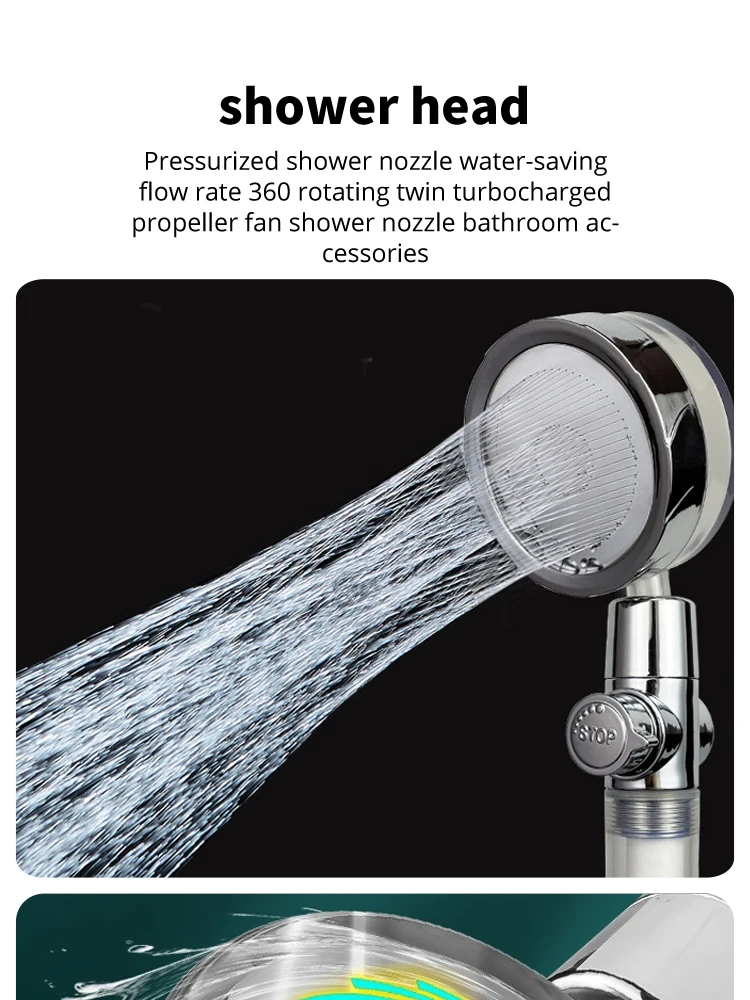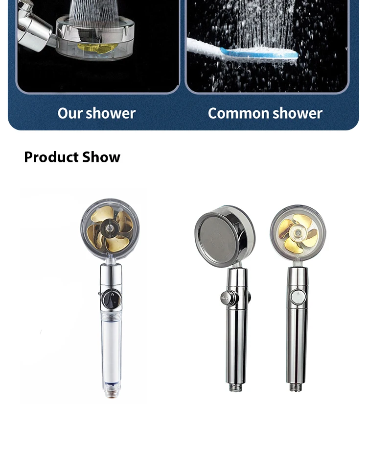 3. Design de alta pressão: O chuveiro cria um fluxo pressurizado de água girando a roda, aumentando a velocidade do fluxo de água e aumentando assim a pressão da água, adequada para baixa pressão da água.