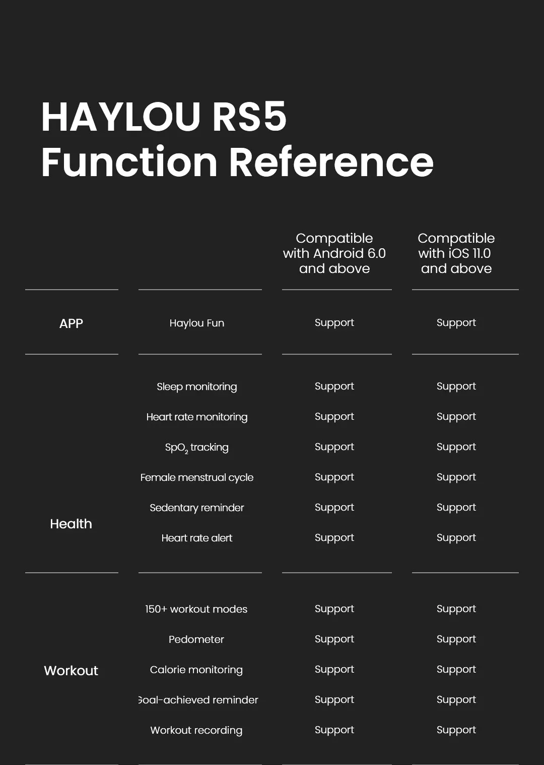 Bluetooth music playback, calculator, multiple theme styles, clock/date display, multiple watch faces, OTA upgrade, call rejection, music control, camera control, incoming call reminder, SMS notification, application push reminder, alarm clock reminder, sedentary reminder, low battery reminder, weather forecast, stopwatch, exercise record, timer, female cycle function, factory reset, firmware information, find phone, do-not-disturb mode